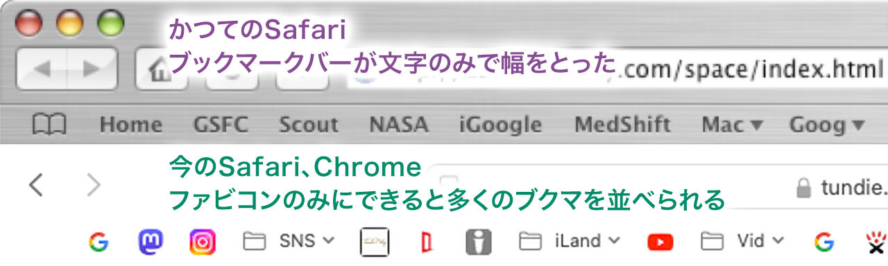 近年までブックマークに、ブックマークしたサイトのファビコン(アイコン)が出ず、サイト名の文字だけを並べる状態でした。
