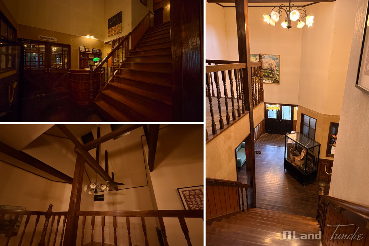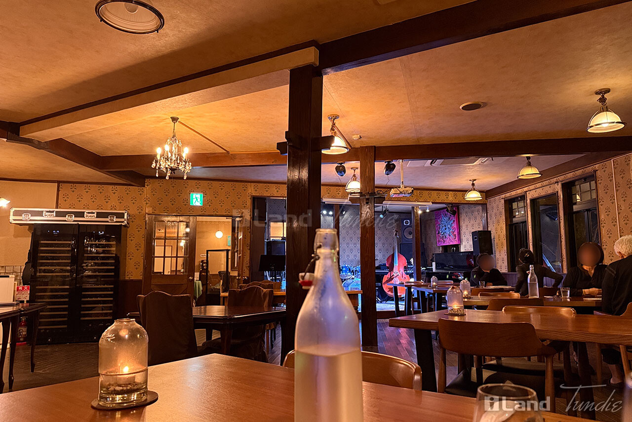 良い雰囲気のレストランフロア。ジャズバンドができる舞台が奥にあります。演奏会もあるのでしょうか。左に見える棚はワインセラー