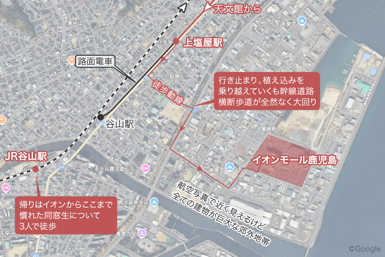 慣れない路面電車に乗車。ひたすら17駅。よく聞く終点「谷山駅」とその手前の「上塩屋駅」の間にイオンがある。上塩屋駅で降りて歩く事に。