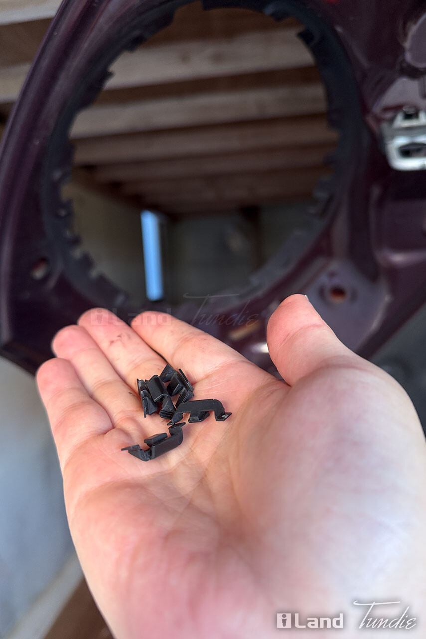 銀メッキのヘッドライトトリムは硬いプラスチック。硬い代わりに柔軟性がありません。そのヘッドライトトリムの裏にツメが作られていて、そこに柔軟性のある黒いプラスチック (クリップと呼ぶとする) が取り付けられています。そのクリップがヘッドライトトリムとエンジンフード (ボンネット) の鉄板を繋ぎ止めている感じ。うちの車で壊れていたのはやはり柔軟性のないヘッドライトトリムのツメ。それが6か所全て折れていました。そしてクリップは全6か所中5か所エンジンフード鉄板の方に着いたまま残っていました。